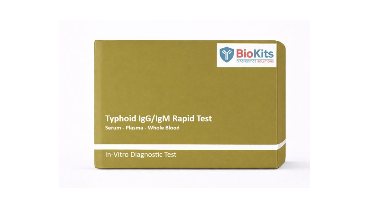 The Biokits Typhoid IgG/IgM Rapid Test is an in-vitro diagnostic, immunochromatographic assay for the qualitative detection and differentiation of IgG and IgM antibodies to Salmonella typhi in human whole blood, serum, or plasma. This test is intended for professional use only.